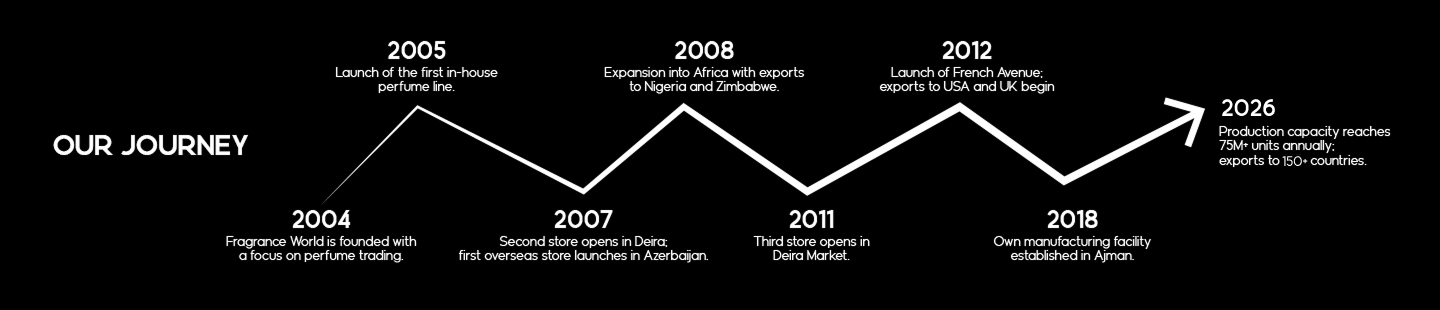 Founded in 2004, Fragrance World began with a vision to create high-quality perfumes that deliver exceptional value and accessibility. What started as a trading venture quickly evolved into a global fragrance house built on craftsmanship, creativity, and trust. From its roots in Deira’s bustling markets to becoming a name recognized across continents, Fragrance World has remained committed to making luxury perfumery an experience for everyone. Today, with state-of-the-art production facilities and a presence in over 150 countries, the company continues to shape the future of fragrance through innovation and integrity.